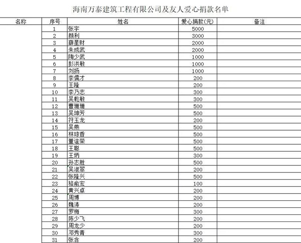1月28日,我们在海南万泰建筑公众号发布了海南万泰公司张小龙总经理和??谑欣夏耆烁@合钅扛涸鹑肆掷蚬餐鲎?万元购买5000个N95口罩及飞利浦G31E病人监护仪1套捐赠给武穴市及张小龙总经理组织同胞募捐的文章《心系荆楚,共渡难关,这场战“疫”,海南万泰在行动!》,在公司引起了极大反响,大家主动问询如何捐款为湖北疫情尽一份力,大家的一腔热血和爱心令人动容,由此,我们迅速成立万泰筹募组,在公司内部展开了爱心捐款。爱心捐款行动一呼百应,在短短不到两天的时间里,万泰募捐组就收到了来自公司员工,万泰各地项目部及公司的合作友人的支持。截止目前,万泰筹募组已筹得284380元的善款!这些善款,我们已全部捐赠给武穴市梅川镇政府用于抗击湖北疫情。捐款情况已向海南省湖北商会,武穴市工商联,武穴市统战部汇报。后续我们将跟踪款项用途。