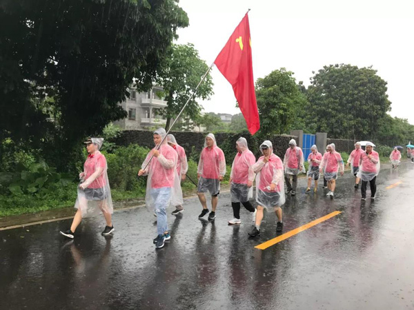 在突来的磅礴大雨中,大家依然坚持前行,努力完成10KM徒步目标。