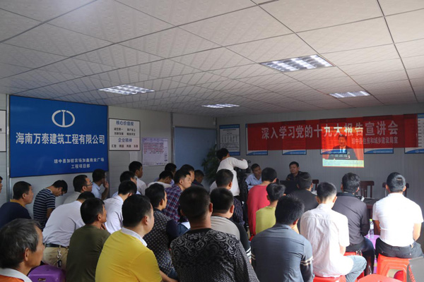 为深入贯彻落实十九大精神,将十九大精神全面、系统的传达给一线工人,按照公司的总体要求和部署,继11月25日成功举行第一次十九大精神宣讲会后,海南万泰计划将在各项目部以丰富多样的形式贯彻落实十九大精神。11月30日,由琼中县住建局相关领导组成的宣讲团到海南万泰承建的琼中县加钗农场加鑫商业广场项目开展十九大精神宣讲会。项目部全体工人、琼中县各工程建设项目代表参加了宣讲会。