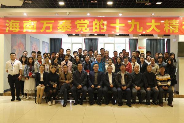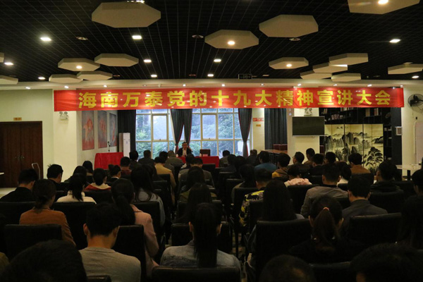为深入贯彻十九大精神,落实十九大精神入基层、进企业的要求,11月25日,湖北省政府驻海南办事处主任、湖北省驻琼党工委书记黄烈焰;副主任、党工委副书记冯??;海南省湖北商会常务副会长、五指山清能地产公司董事长罗晓东组成的宣讲团到海南万泰建筑工程有限公司宣传贯彻党的十九大精神。