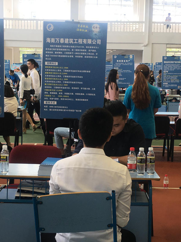 为积极响应相关就业政策,减轻社会就业压力,履行企业社会责任,为众多应届毕业生提供前景广阔的就业岗位,同时,落实推进公司人才建设计划,配合公司发展战略目标,进一步强化人才队伍建设,搭建起企业招贤引才的开放平台,11月3日下午,海南万泰指派行政人事部相关人员前往桂林洋高校区,参加在??诰醚г壕侔斓拇笮托T罢衅富?。