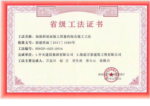 长期以来,海南万泰都格外注重施工过程管理,通过不断的摸索、试验和创新运用,掌握了关键技术及操作要点,多项工法成果先后获得省级工法。此次再获殊荣,充分反映出了万泰在工法创新应用上的突出成绩,为后续更多工法的创新、应用打下了坚实的基础。同时,也对提升公司市场竞争力、品牌知名度发挥了积极的推动作用。