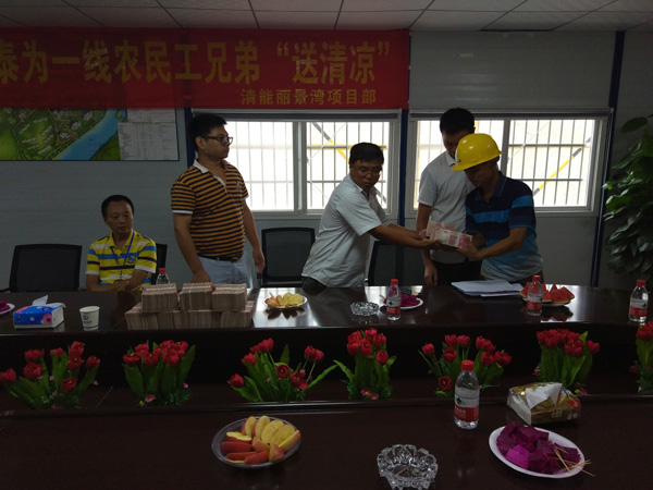 海南万泰建筑工程有限公司五指山清能·丽景湾一期一标项目部在会议室组织农民工工资集体发放暨海南万泰建筑工程有限公司“送清凉”活动。此次共计发放农民工工资150余万元现金。共送去夏季防暑凉茶50箱、绿豆300斤、冰糖150斤等一批物质。