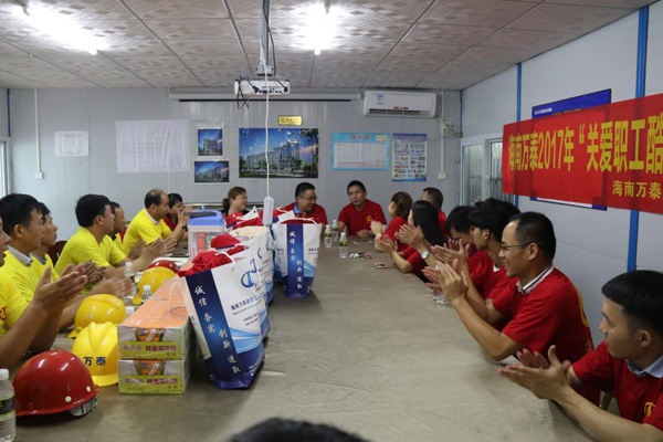 海南万泰在追求企业发展的同时,始终把民工利益摆在重要位置,关爱民工工作生活。长期以来,海南万泰都对一线工人的生产生活格外重视,通过节日慰问、送清凉等一系列活动,深切表达公司领导及同事对长期驻扎一线的项目工人的关怀之情。