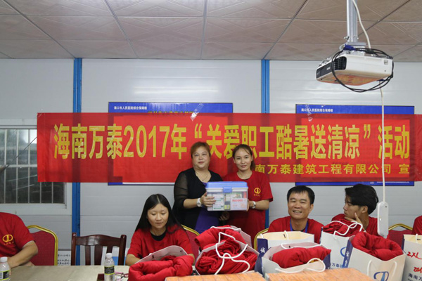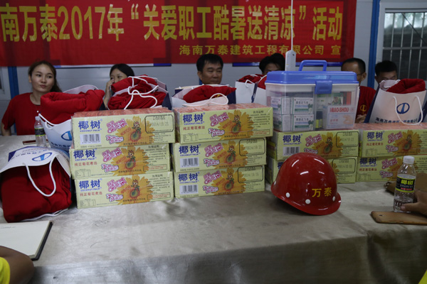 本次送清凉活动,海南万泰公司共送出14箱菊花茶,400件T恤以及部分应急医药品。项目部林总代表项目工人对公司的关怀及慰问表示由衷的感谢。