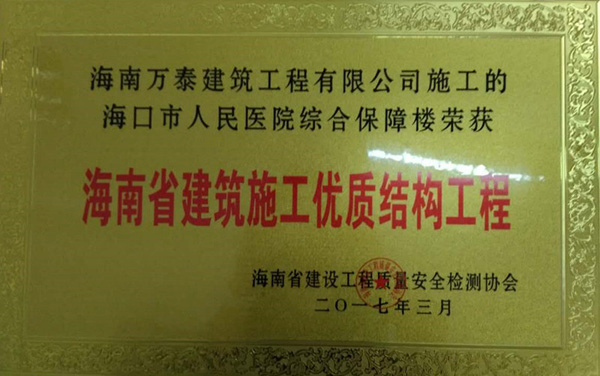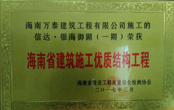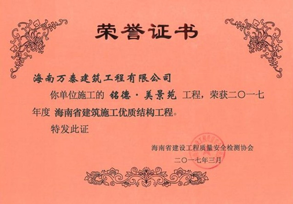 2017年6月20日,经过了长期的严格评审之后,由海南万泰承建的??谑腥嗣褚皆鹤酆媳U下ァ⑶砗P糯镆Sㄒ黄冢?、铭德.美景苑三个项目全部通过基础、主体阶段的评审,并荣获海南省建设工程质量安全检测协会颁发的《海南省建筑施工优质结构工程》证书。至此,继“蓝城商务大厦 ”荣获“椰城杯”后,万泰工程再斩殊荣。值得一提的是,这已经是万泰本年度第三次荣获相关奖项。