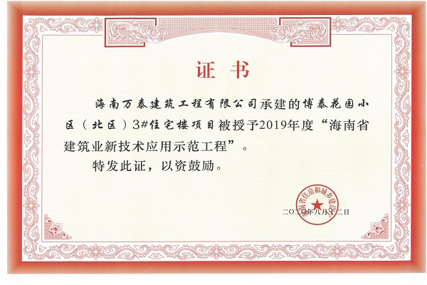 近日,从海南省住房和城乡建设厅传来喜讯,由海南万泰建筑工程有限公司承建的“博泰花园小区(北区)3#住宅楼项目”和“联合产权酒店项目”荣获2019年度“海南省建筑业新技术应用示范工程”。