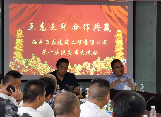 为培育并形成战略认同、文化认同,共同发展、高度一致的命运共同体、利益共同体,深化合作关系,8月16日上午,海南万泰建筑工程有限公司举办第一届供应商大会暨劳务班组大会。公司常务副总颜利、副总张宇和来自全省各地的60多家优秀供应商代表及30多家劳务班组代表共聚一堂,就进一步巩固长期良好合作关系进行交流座谈。