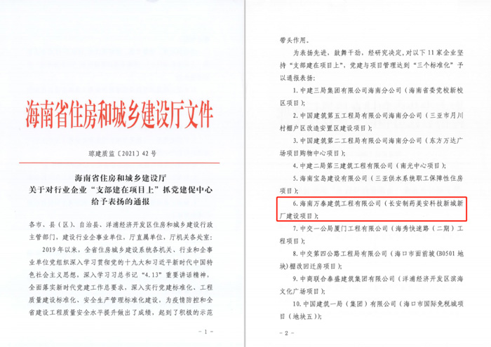 阳春三月春意浓,牛年大吉开门红!喜庆春节刚过,迎来十四五开局,恰逢全国“两会”胜利召开之际,海南万泰建筑工程有限公司长安制药美安科技新城新厂建设项目荣获海南省住房和城乡建设厅对“支部建在项目上”抓党建促中心工作通报表扬,全省共11家企业获得此殊荣,海南万泰为获表彰的民企之一。