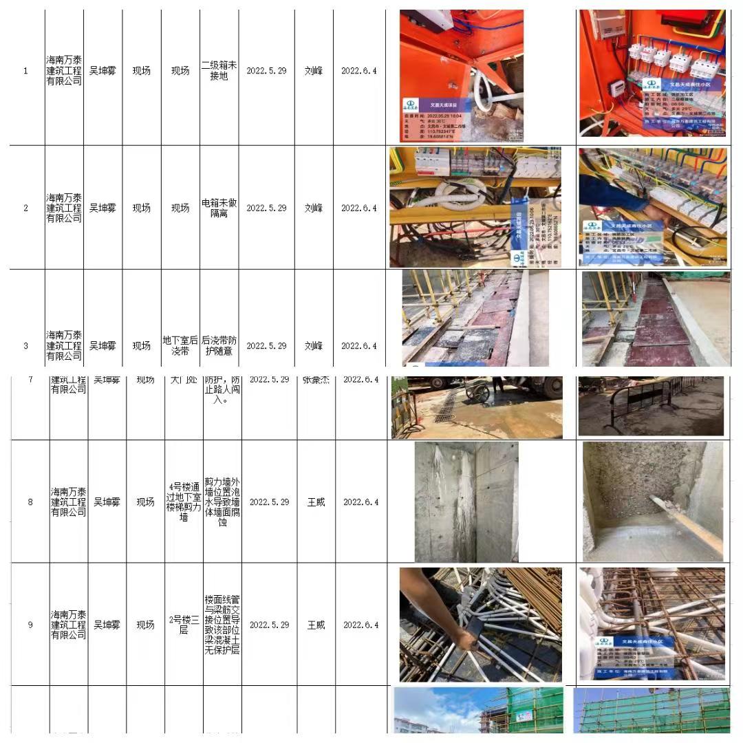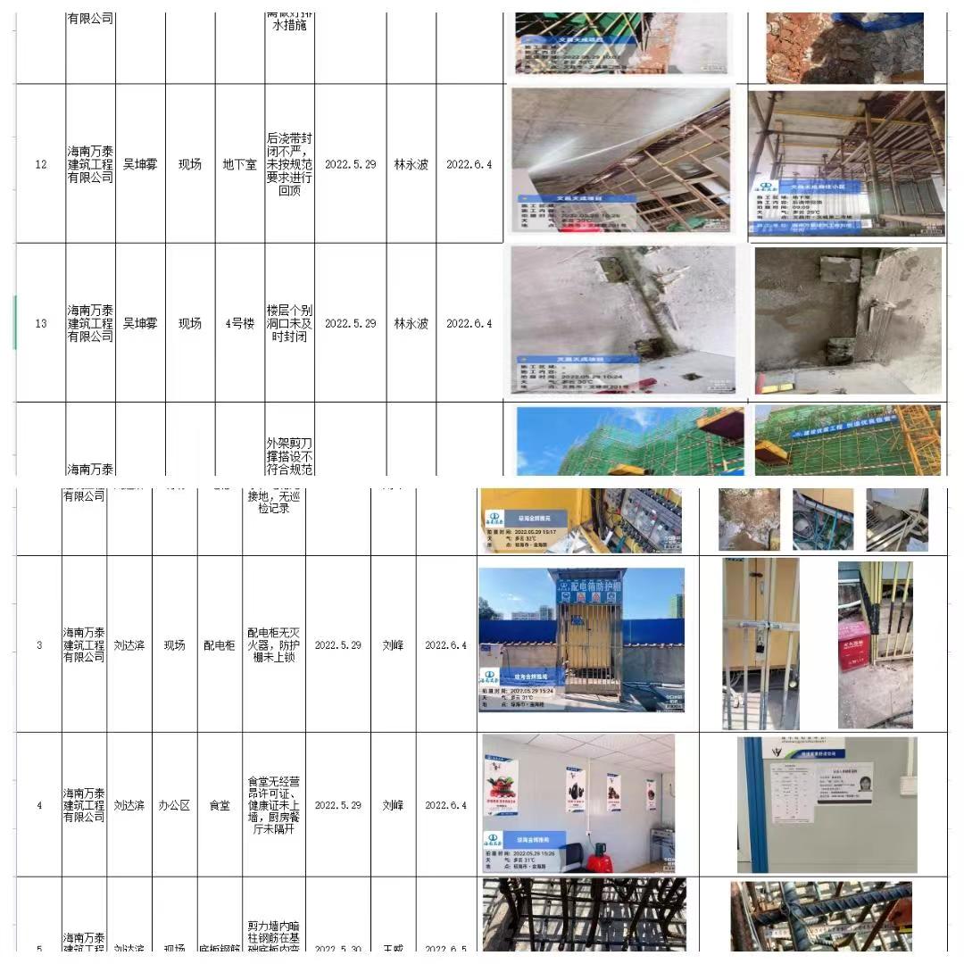 为落实海南省住建厅关于《海南省房屋市政工程安全生产治理行动实施方案》以及“党建引领促发展”2022年“安全生产月”活动暨项目标准管理宣贯大会的有关要求,进一步推动项目安全生产工作做深做实,履行安全生产监管职责,树立安全生产发展理念,结合全国安全生产月活动,2022年5月20日至6月8日,海南万泰公司开展2022年“安全生产月”各项目安全生产治理行动。本次检查小组由公司工程部人员组成,分别对海南省政务服务中心二期项目、海南省第三人民医院项目、化药生产及研发基地(二期)项目、佳元?七彩澜湾南区商业、四季康城?水岸城邦、三亚国际传媒中心项目二期等省内26余个在建项目进行系统、全面、彻底的检查。