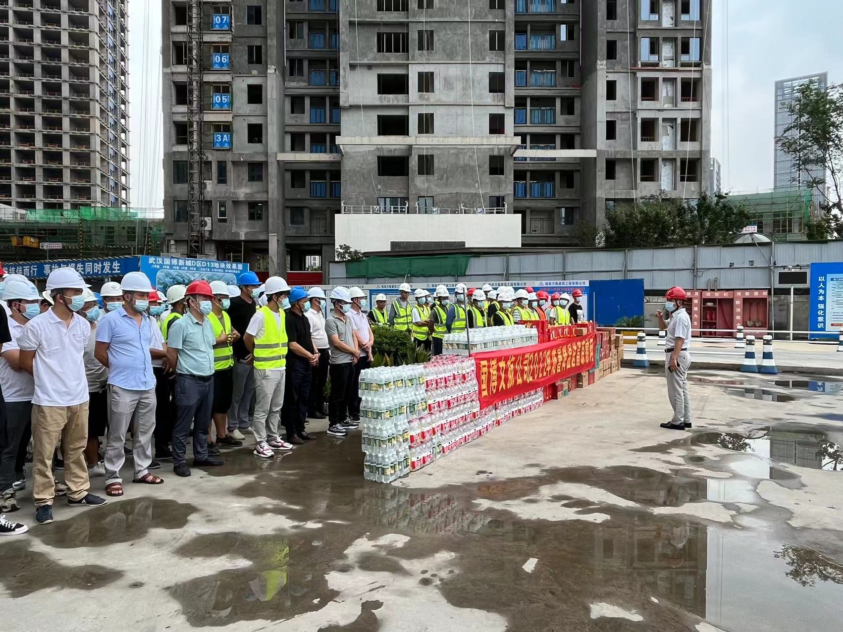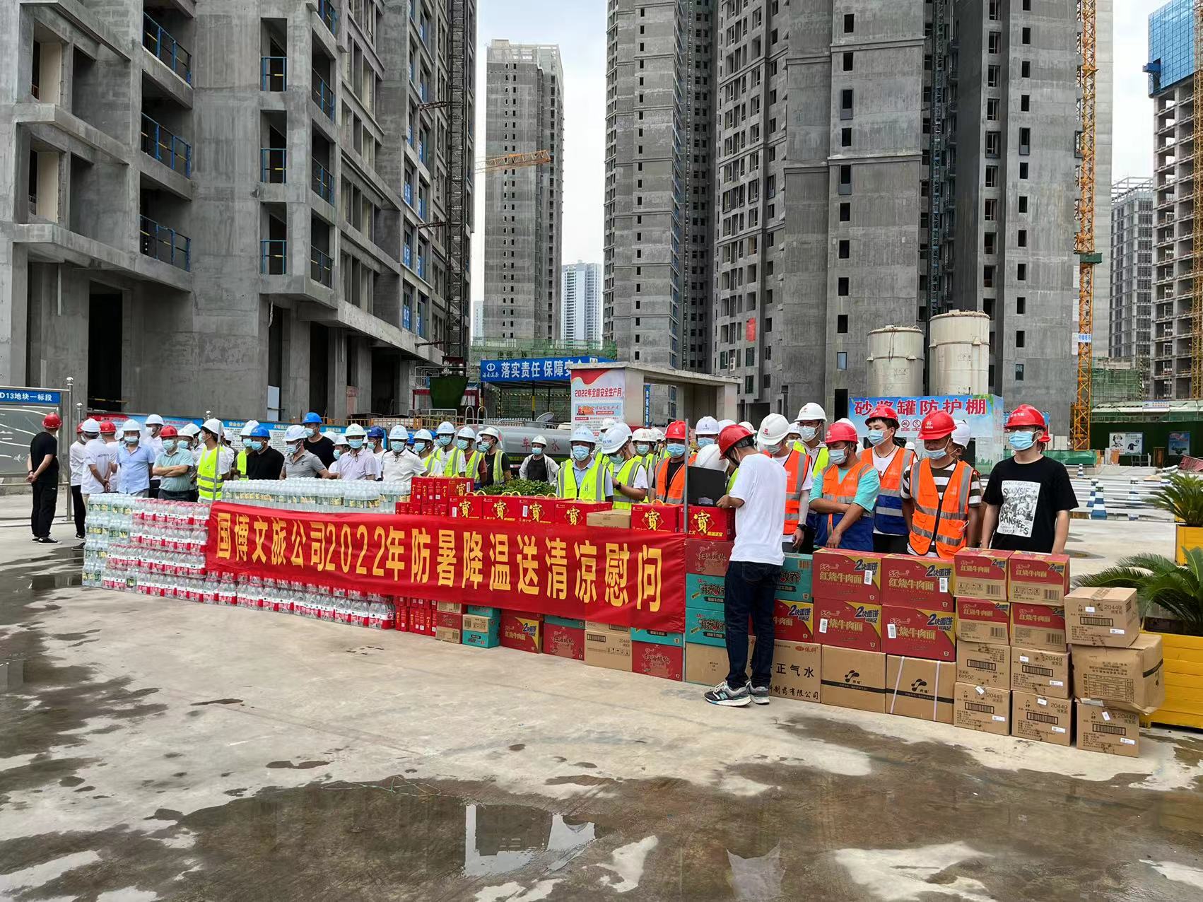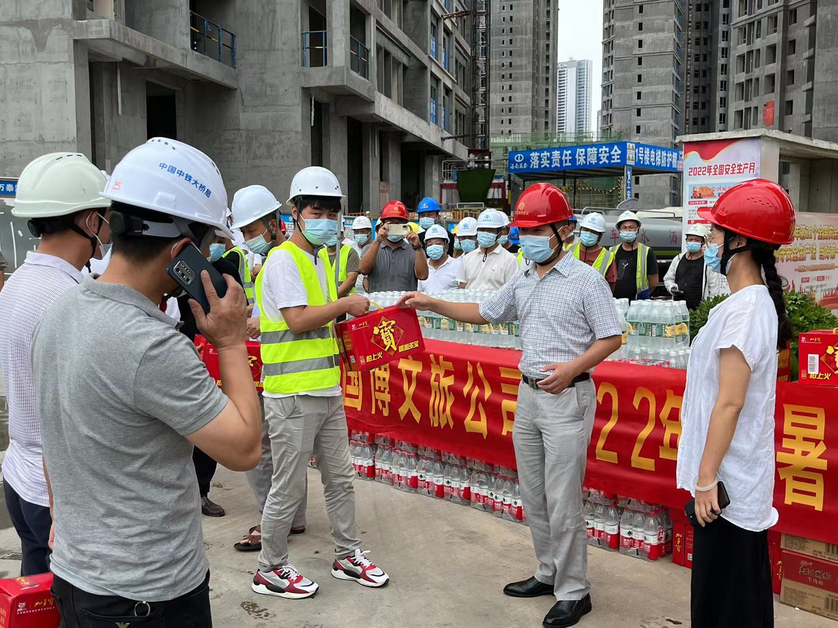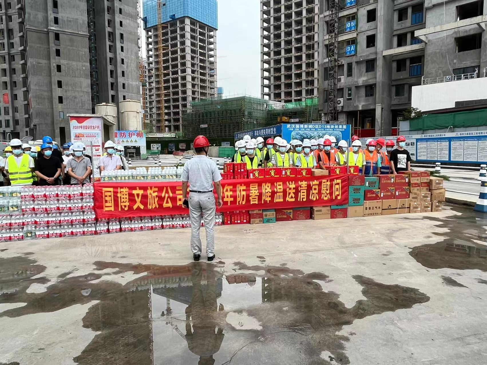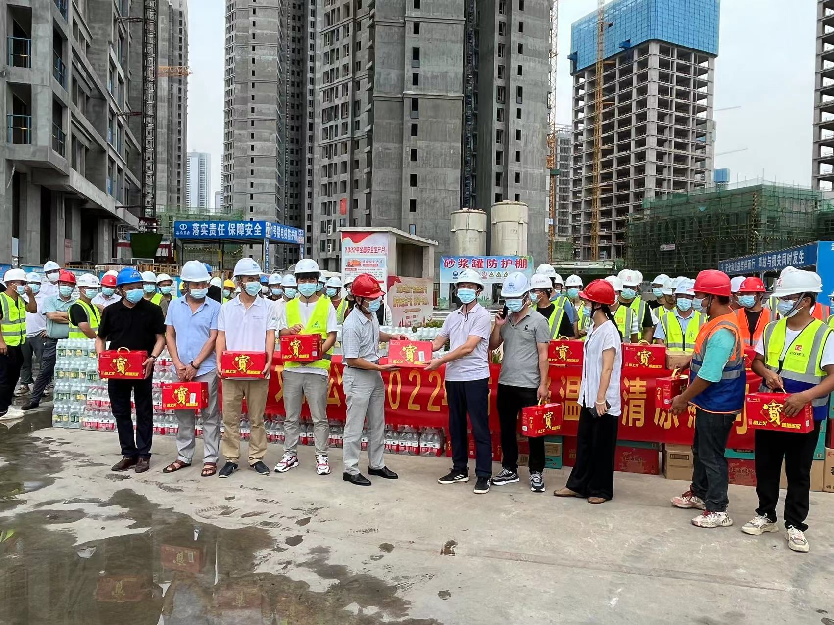 夏日送清凉,真情沁人心。2022年7月28日,武汉国博文旅公司在武汉国博新城DⅡ、D13、D14、C2、C4地块成功举办2022年“夏送清凉”一线工人慰问活动。武汉国博文旅副总经理江立伟、质安部张部长,海南万泰湖北分公司承建的武汉国博新城D区D13地块一标段项目经理陶少武以及中铁大桥局,中国中冶,上海建工、武汉建工,天时建安,中铁四局,方正监理,天衡监理,武院监理等十四家公司相关人员参加本次慰问活动。