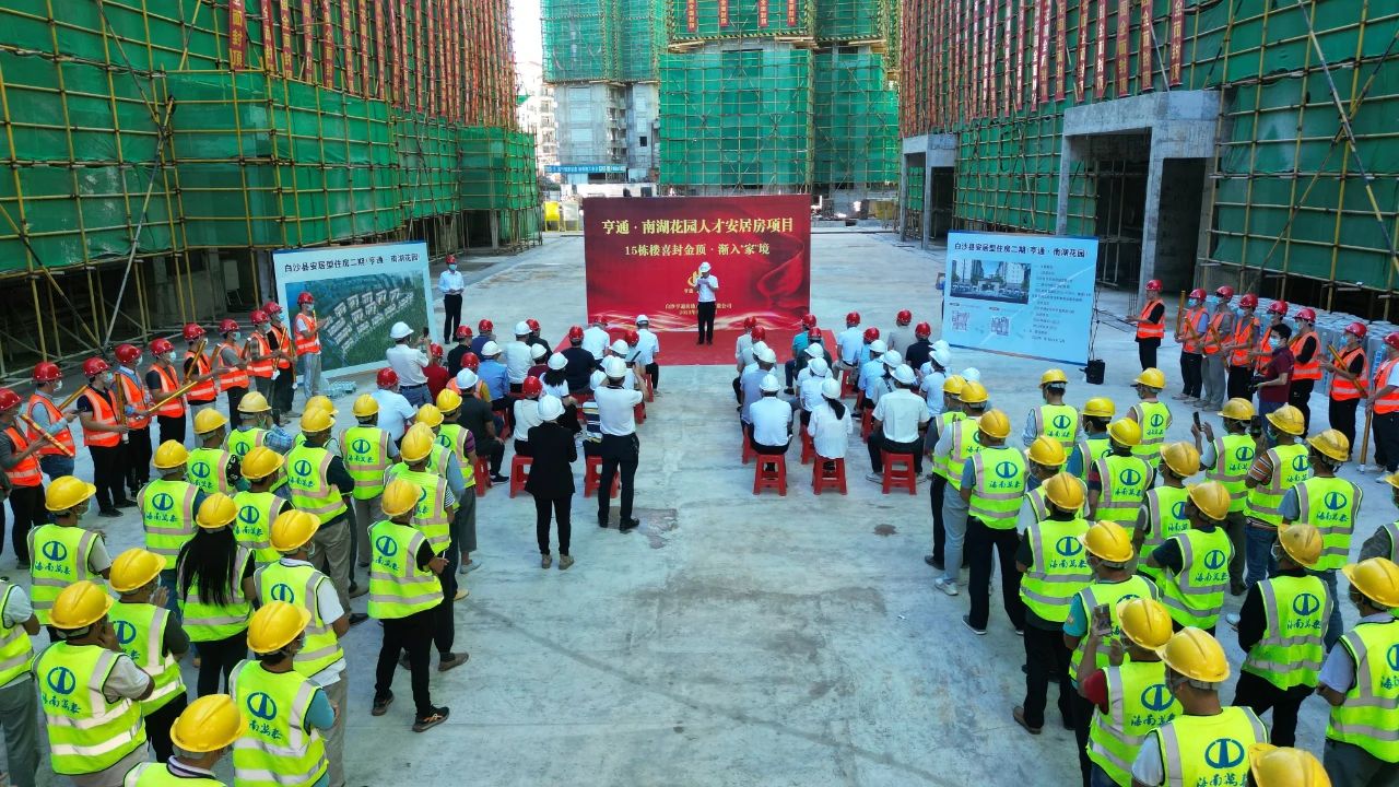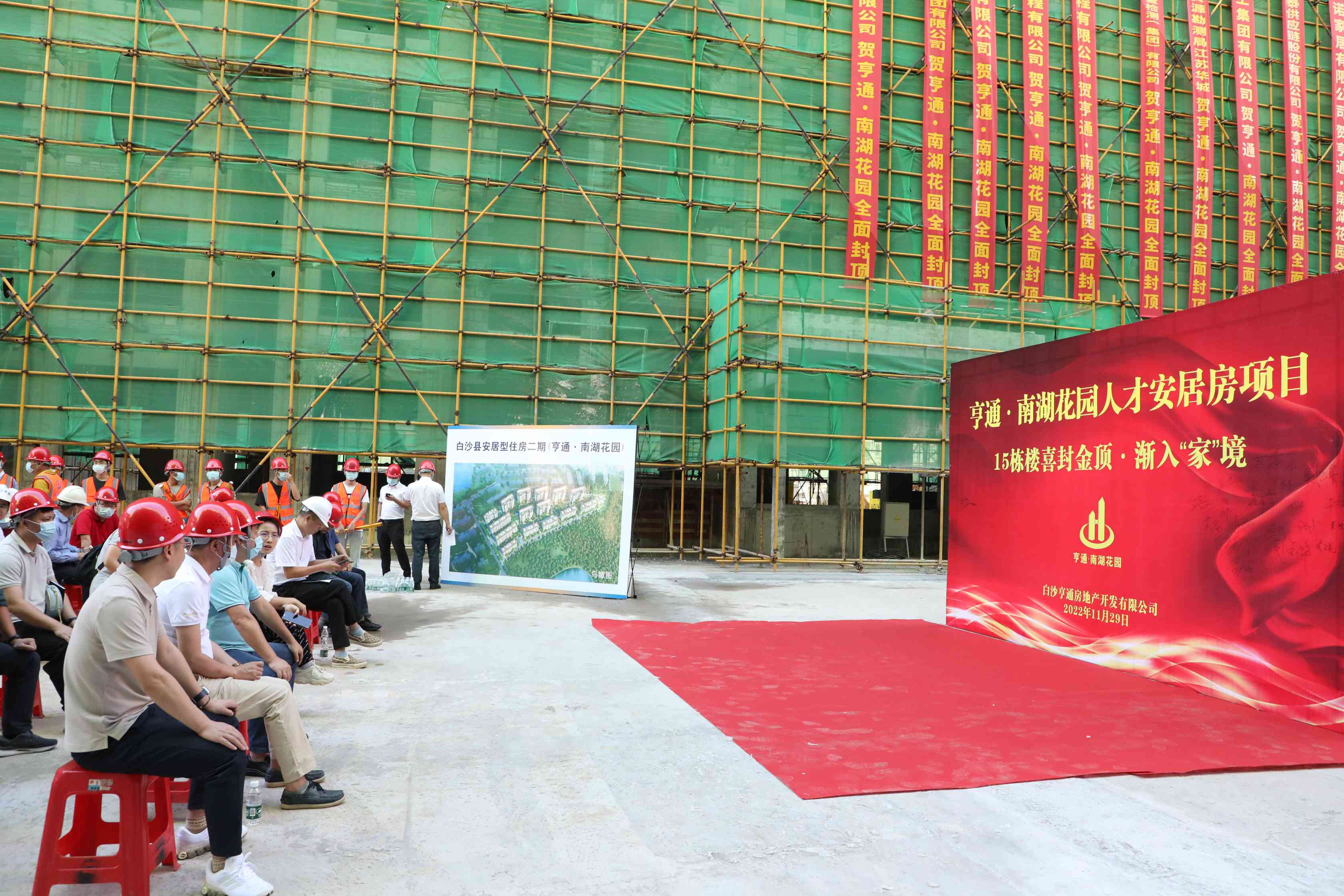 为了贯彻落实党的二十大精神,加快推进白沙重点民生工程建设,致力于打造宜居新生活,2022年11月29日,由海南万泰建筑工程有限公司承建的省重点安居房项目——白沙亨通·南湖花园项目主体结构全面封顶仪式圆满举行。白沙县住建局、审批局、资规局、不动产中心及融媒体中心相关负责人,亨通安居集团董事长周金华,万泰公司副总经理张宇、工程部部长侯领等有关人员参加本次封顶仪式,一同见证这一喜庆时刻。仪式由亨通安居集团经理冼继利主持。