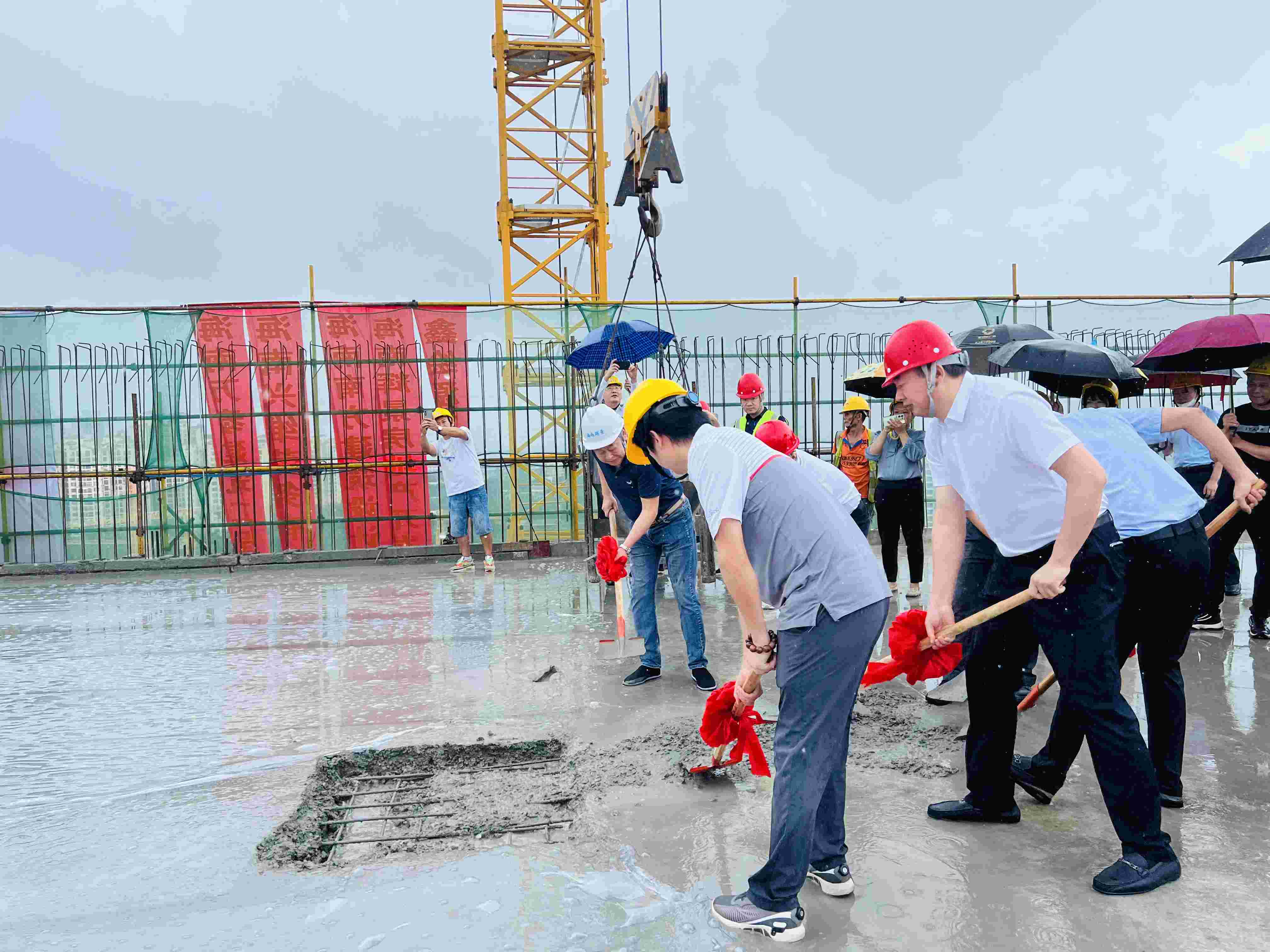 大家在做好安全防护措施后一起走上了顶楼,伴随着礼花的炮鸣声,共同为项目主体结构的最后一块区域浇筑混凝土。随后,海南万泰公司颜利总正式宣布项目主体结构封顶成功。