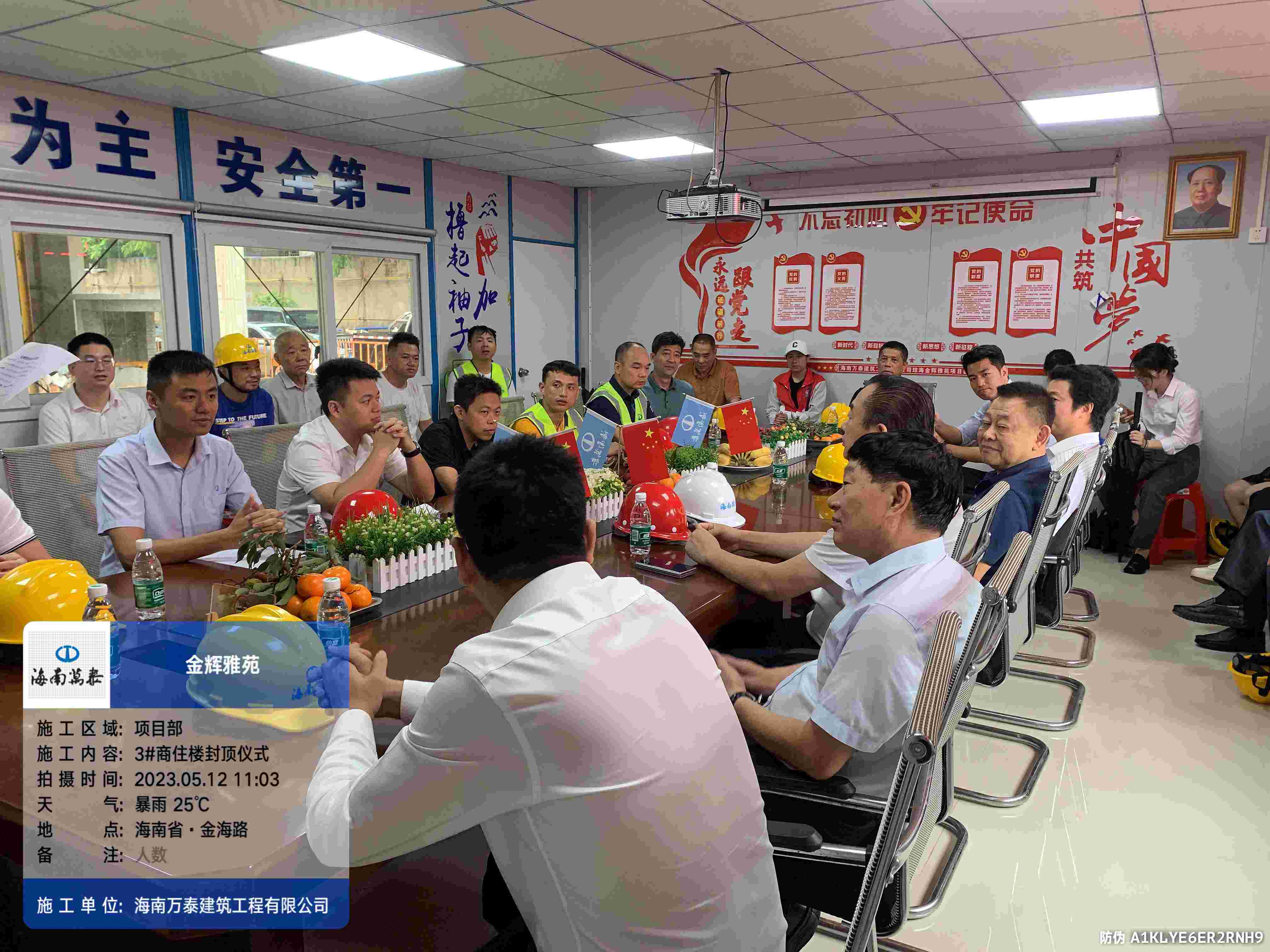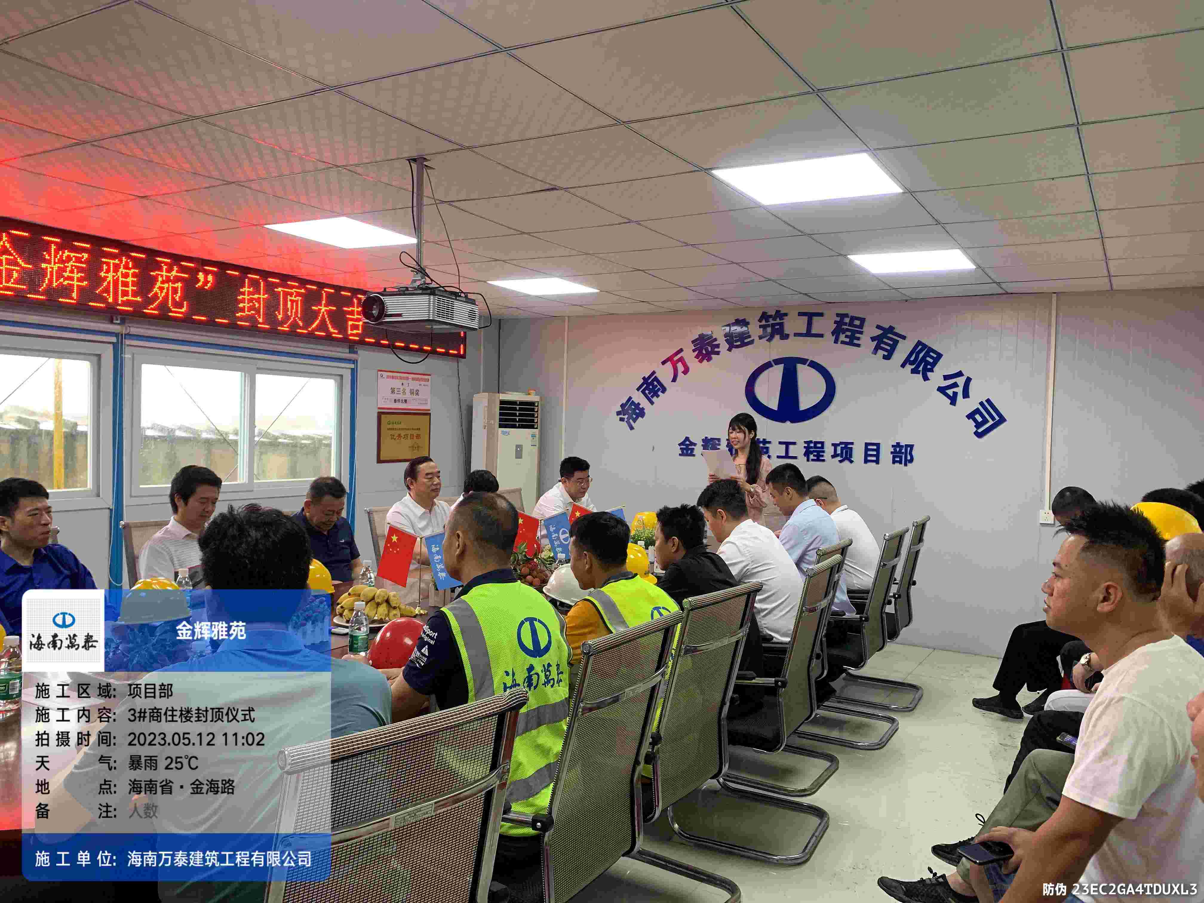 金梁拔地千年固,玉柱擎天万事兴。2023年5月12日上午,海南万泰承建的琼海金辉雅苑项目喜封金顶,封顶仪式在项目工地现场圆满举办,海南辉景房地产开发有限责任公司董事长刘辉、股东文靖杰、总经理陈小勇,海南万泰建筑工程有限公司常务副总经理颜利、工程一处总助袁军、工程部副部长张豪杰、项目经理刘达滨以及监理等参与和支持项目建设的各级领导出席了本次活动,共同见证这一喜庆时刻。