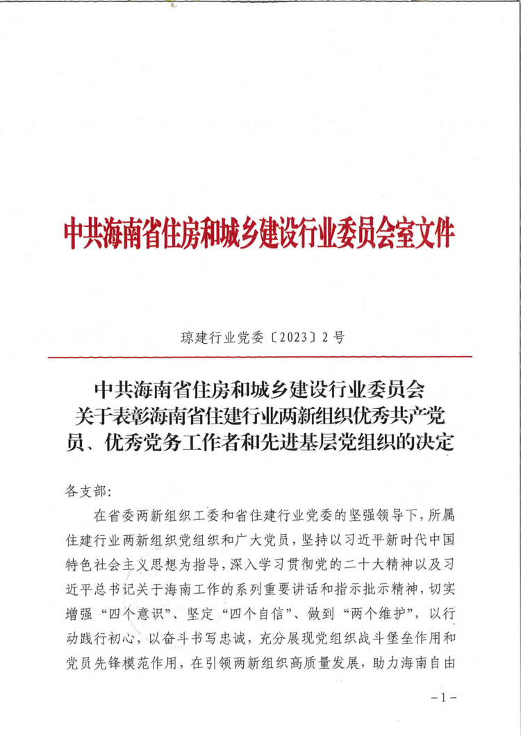 盛夏七月,喜事连连。在庆祝中国共产党成立102周年之际,根据海南省住建行业党委《关于表彰海南省住建行业两新组织优秀共产党员、优秀党务工作者和先进基层党组织的决定》的通知,海南万泰建筑工程有限公司党支部喜获2021-2022年度“海南省住建行业两新组织先进基层党组织”荣誉称号;公司党支部的3名党员同志分别喜获2021-2022年度海南省住建行业两新组织“优秀共产党员”以及“优秀党务工作者”荣誉称号。