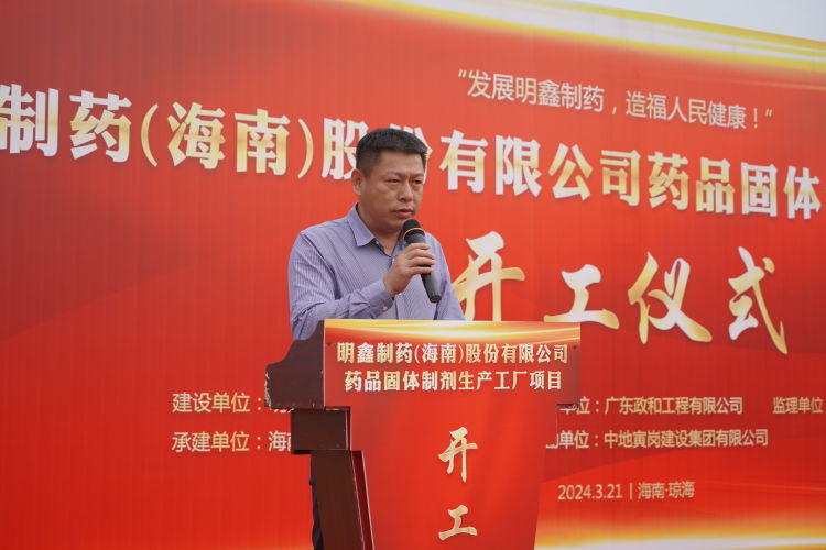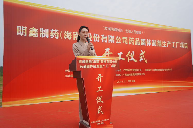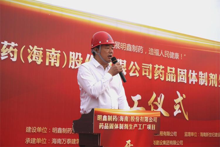 明鑫制药海南公司董事长金佳乐在致辞中表示该项目建成后将进一步提升琼海市医药服务水平,希望各参建单位都能够齐心协力推进项目建设,高标准、高质量完成既定施工任务,助力海南自贸港发展。