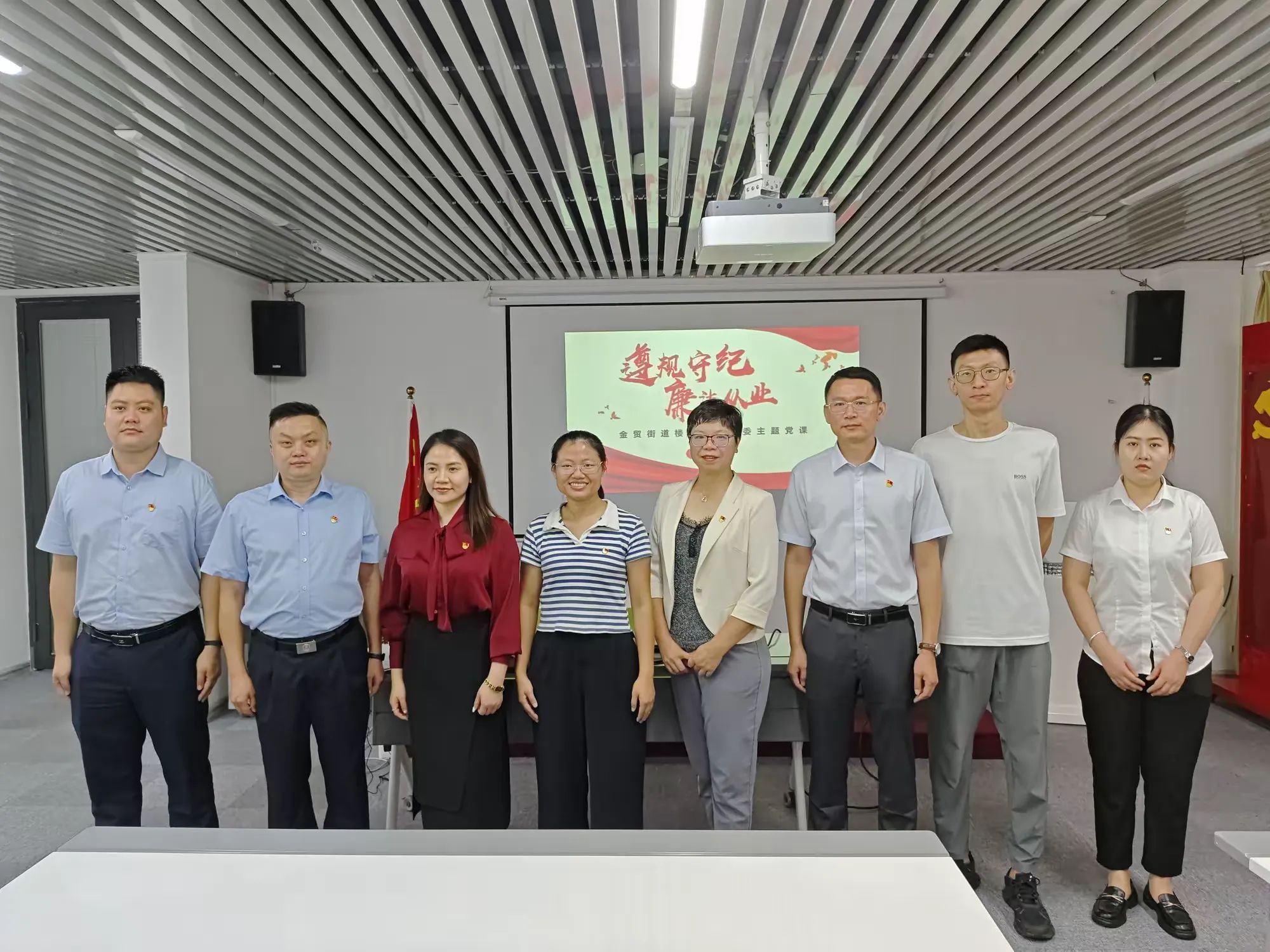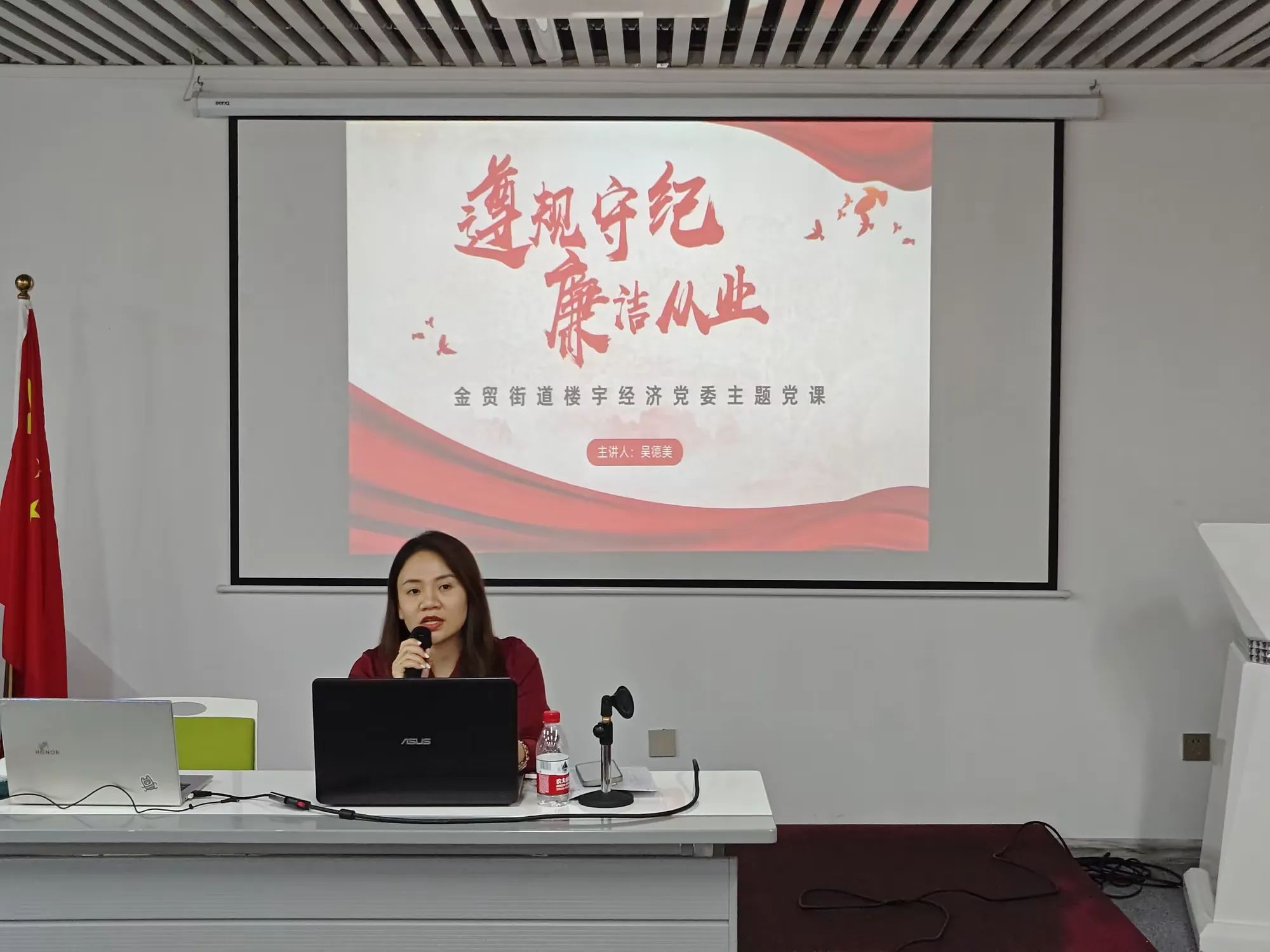 活动中,金贸街道楼宇经济党委书记吴德美以“遵规守纪 廉洁从业”为主题为大家讲授了一堂深刻的党课,从廉洁从业的有关规定、意义、企业关键岗位廉洁风险点及防控措施、警示案例等多方面强调了廉洁从业的重要性。