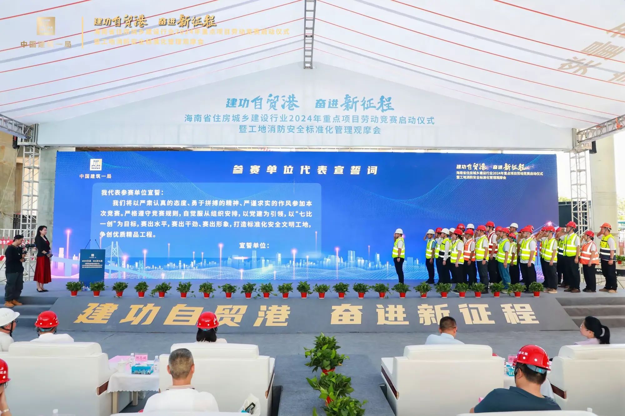 在启动仪式现场,公司林慧同志作为29名海南省住房城乡建设行业2023年重点项目劳动竞赛“先进个人”之一上台领奖,张豪杰同志作为公司代表上台进行参赛单位宣誓。本次劳动竞赛以“七比一创”为主要内容,即“比党建引领、比工程进度、比工程质量、比安全生产、比科学管理、比技术创新、比文明施工、创优质工程”,进一步激发广大职工不断提升自身能力水平,勇于奉献、干事创业的热情。