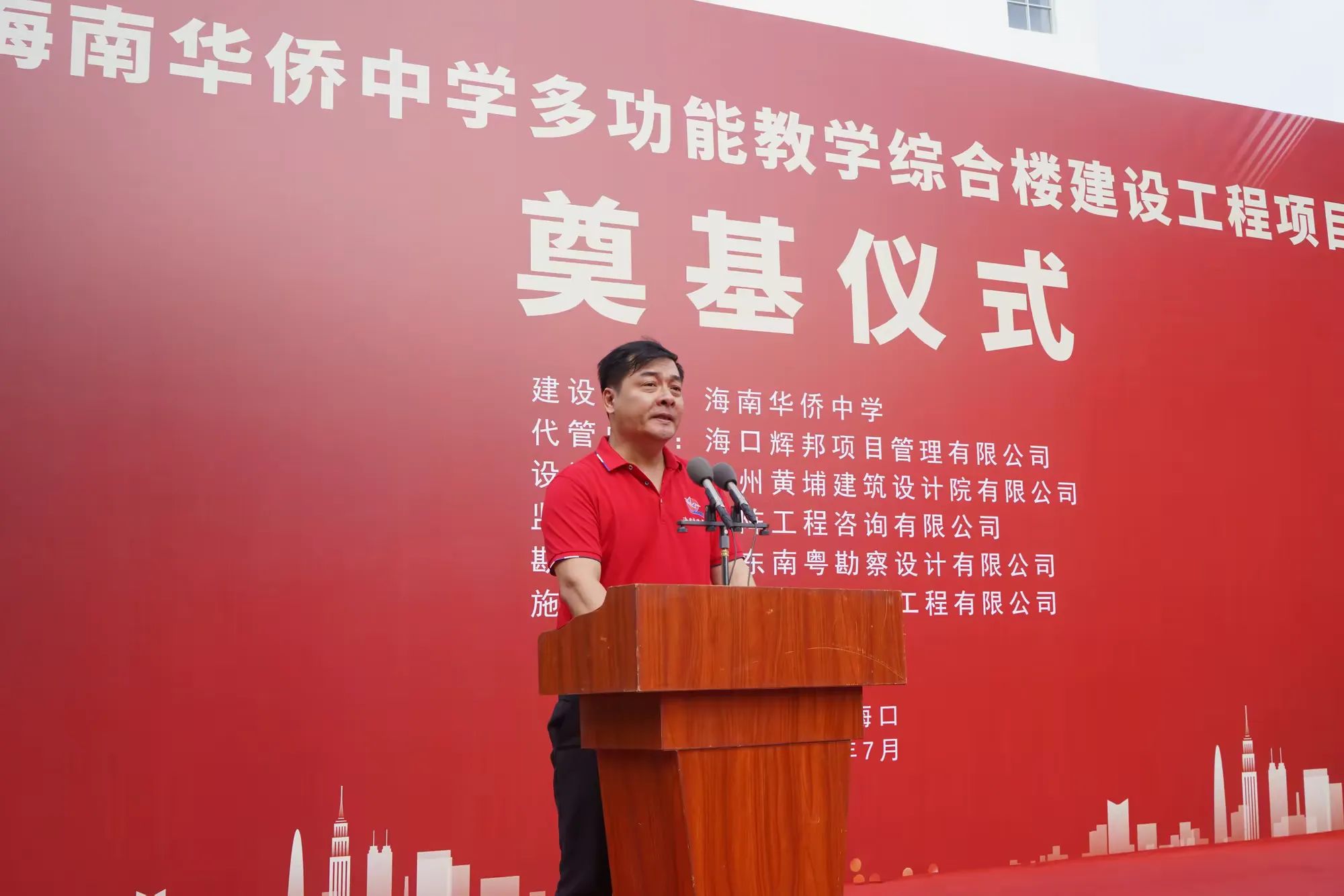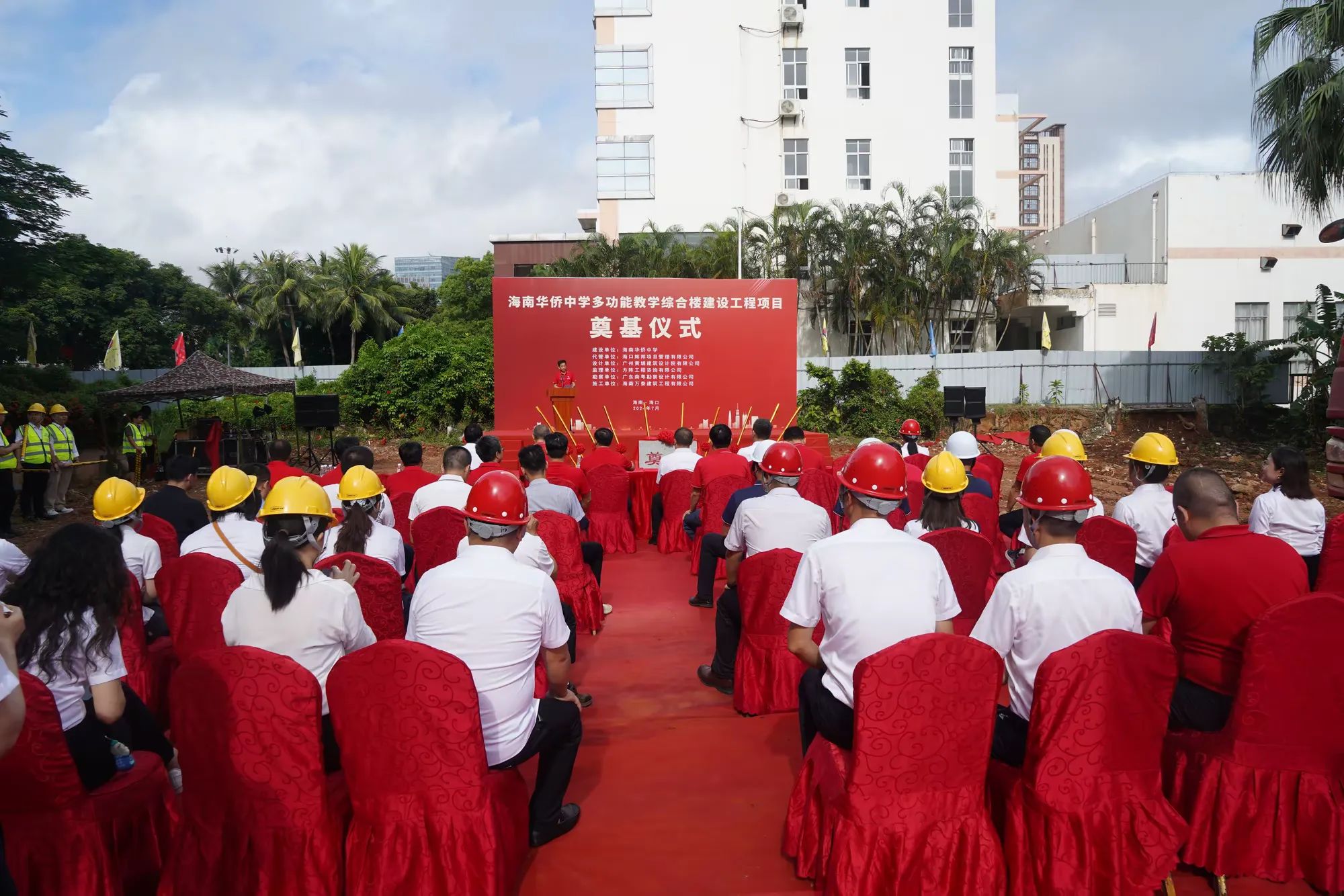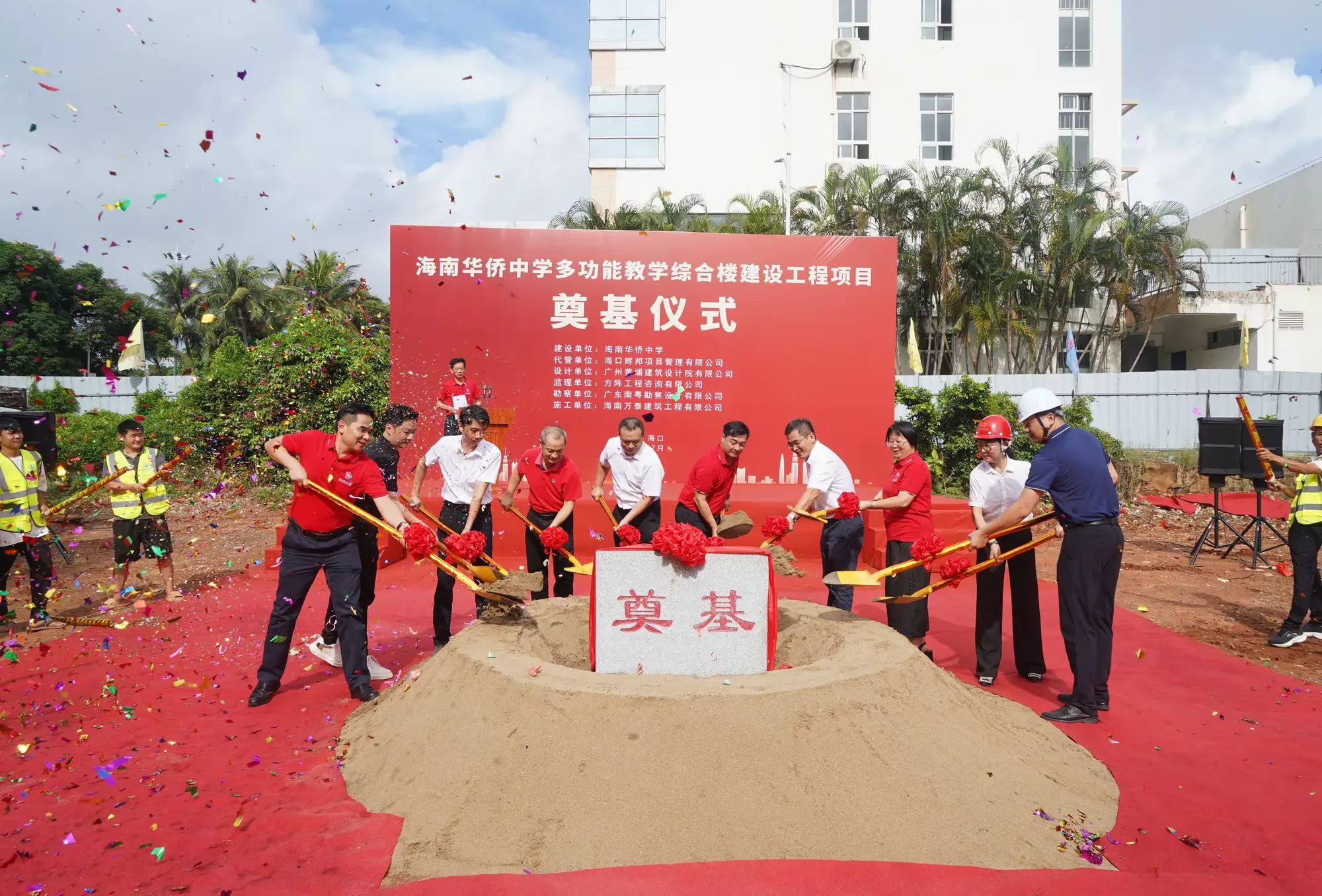 七月绿意争相艳,书生意气冠琼州。7月19日,由海南万泰建筑工程有限公司承建的海南华侨中学多功能教学综合楼建设工程项目举行开工仪式。??谑蟹⒏奈匙槌稍?、副主任庄华东,海南华侨中学党委副书记、校长张伟,党委委员、副校长吴撼宇,??谑谐峭都诺澄笔榧恰⒍?、总经理孙传志以及代管、监理、施工单位相关人员参加了本次活动。仪式由海南华侨中学副校长吴泽纯主持。