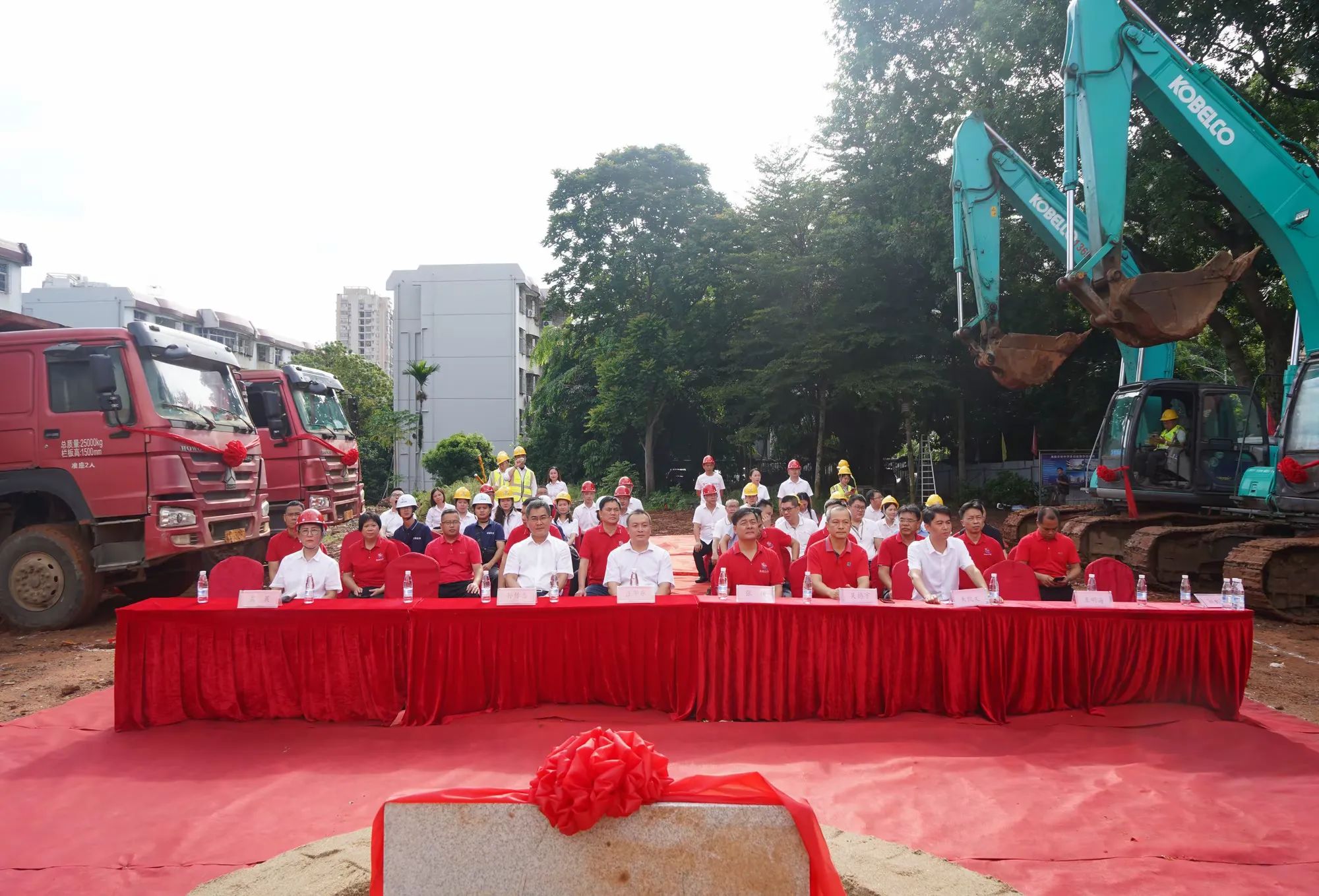 ??谑蟹⒏奈匙槌稍?、副主任庄华东宣布海南华侨中学多功能教学综合楼建设工程项目开工。隆隆的礼炮声与掌声预祝着项目开工大吉。