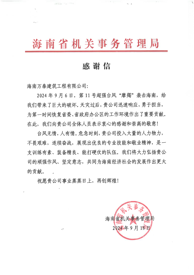 近日,海南万泰建筑工程有限公司收到一封来自海南省机关事务管理局的感谢信。信中感谢了海南万泰公司在台风刚过后,迅速响应,勇于担当,组织力量投入超强台风“摩羯”灾后的道路清障工作,为第一时间恢复省委、省政府办公区的工作环境作出了重要贡献。