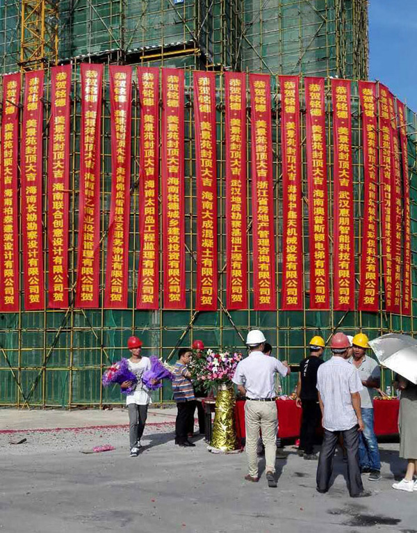 10月16日上午,由海南万泰建筑工程有限公司承建的铭德?美景苑项目1、2、3号楼在业主、监理及项目部领导的见证下主体顺利封顶,现场鞭炮齐鸣,气氛热烈。