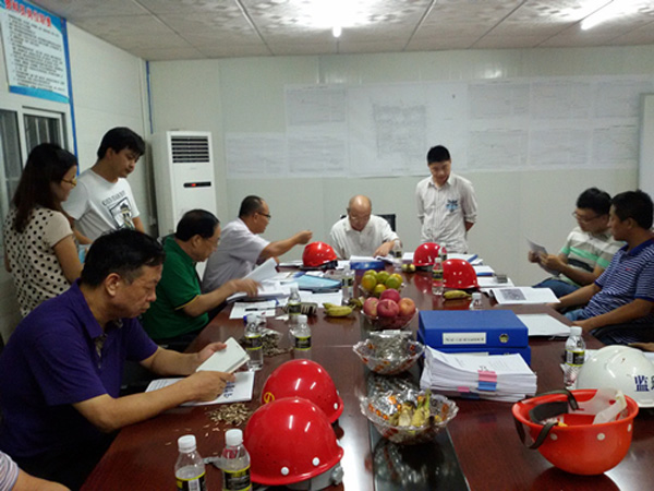 此次“省优质结构”第一阶段评审是检查地基基础和地下室结构。评定内容包括工程施工过程的管理工作质量、建材产品质量、施工操作质量、工程实体质量和环境质量。此次评审会议分三个步骤进行。首先施工单位汇报项目施工质量情况,然后在万泰公司工程部及项目部人员的陪同下,检查组专家认真细致的查看施工现场,对施工现场管理、外观质量进行了认真检查和询问,最后在项目部会议室检查了施工资料及对此次评审的情况向项目部进行了反馈。