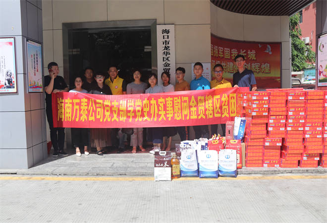 5月26日下午,海南万泰公司党支部、工会组织开展“学党史、践初心、办实事、献爱心”活动,为金贸辖区部分贫困家庭送去了慰问金,米、油、红薯等生活物资。
