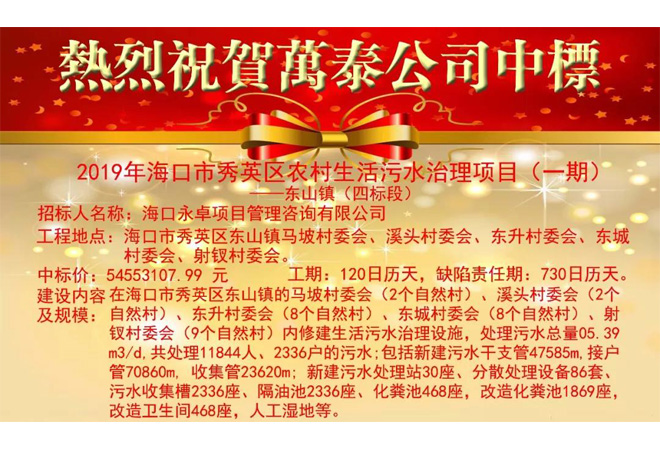 热烈祝贺海南万泰中标2019年??谑行阌⑶┐迳钗鬯卫硐钅浚ㄒ黄冢?东山镇(四标段)