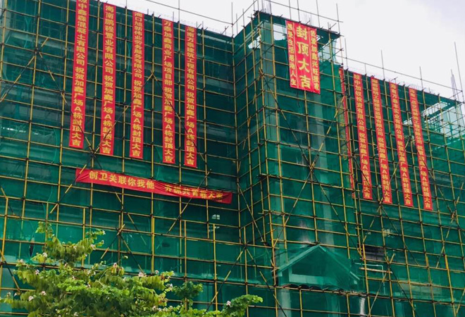 10月24日,海南万泰建筑工程有限公司承建的琼中县加钗农场加鑫商业广场项目施工现场彩旗飘飘,横幅高挂。随着主体建设的完成,琼中县加钗农场加鑫商业广场项目A栋楼完成了阶段性建设任务,顺利封顶。