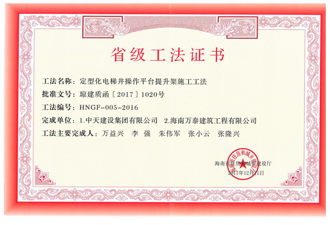 2017年12月5日,海南省住房和城乡建设厅发布公告,公布了2016年度海南省省级工法名单。海南万泰建筑工程有限公司申报的两项工法(定型化电梯井操作平台提升架施工工法、加强斜屋面施工质量的组合施工工法)名列榜单,且得票数均为13票,得票率百分之百。