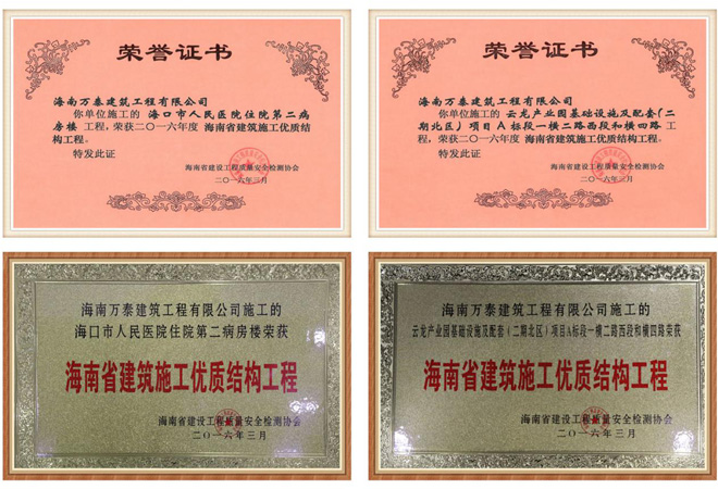 2016年3月,由海南万泰建筑工程有限公司承建的“海口市人民医院住院第二病房楼”及“云龙产业园基础设施及配套(二期)项目”工程被海南省建设工程质量安全检测协会评为《海南省建筑施工优质结构工程》荣誉称号。